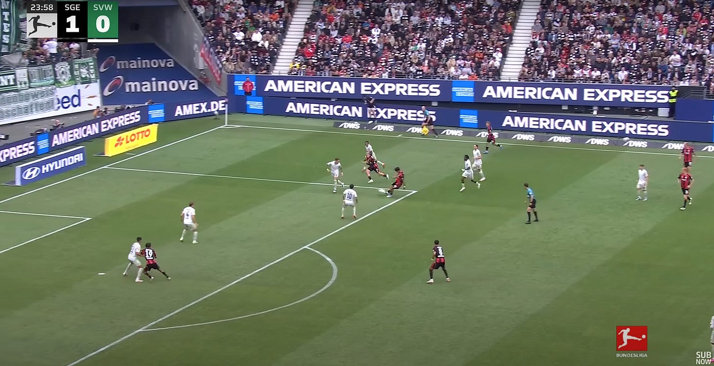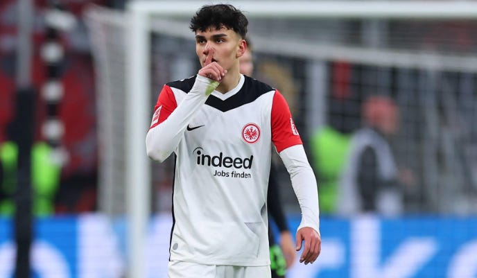 Our focus today is on the 19 years old Can Uzun, the Eintracht Frankfurt midfielder who has made an impressive start to the season, scoring 5 goals and providing three 3 so far in 6 matches. On the chart, Uzun appears in the bottom-right quadrant, meaning he exceeds the 75th percentile in progressive passes per 90, but falls short of that threshold in progressive distance per 90.