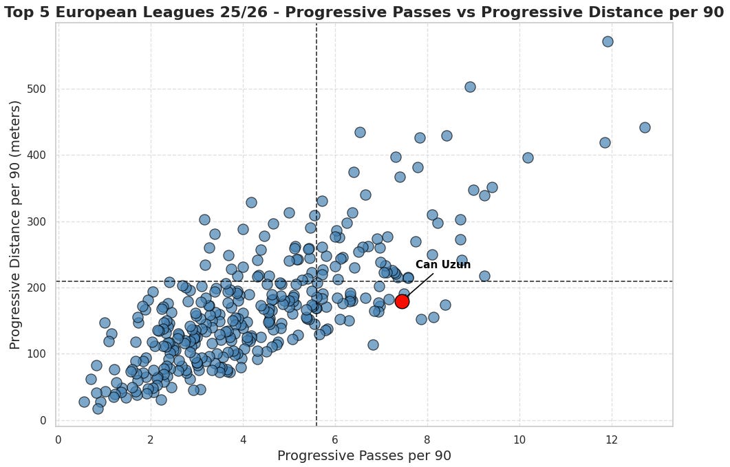 This marks the start of a new series where we use data to highlight players who are currently performing at a high level. For this first analysis, we examined passing data from the 2025/26 season across Europe’s top five leagues, focusing on two key metrics: progressive passes and progressive distance. To ensure fair comparisons, all figures were normalized per 90 minutes.